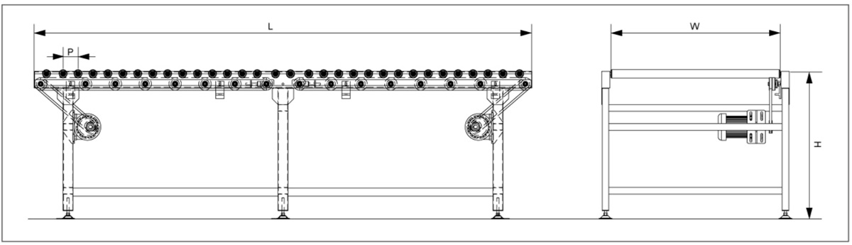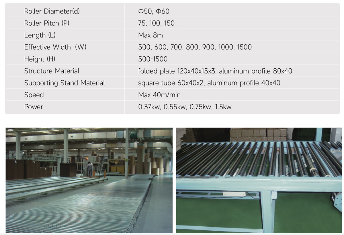 The most widely used roller conveyor for a conveyor line with boxes packaged. Applicable to the delivery of any type of product, whether it be in a box, a bag, or a pallet.